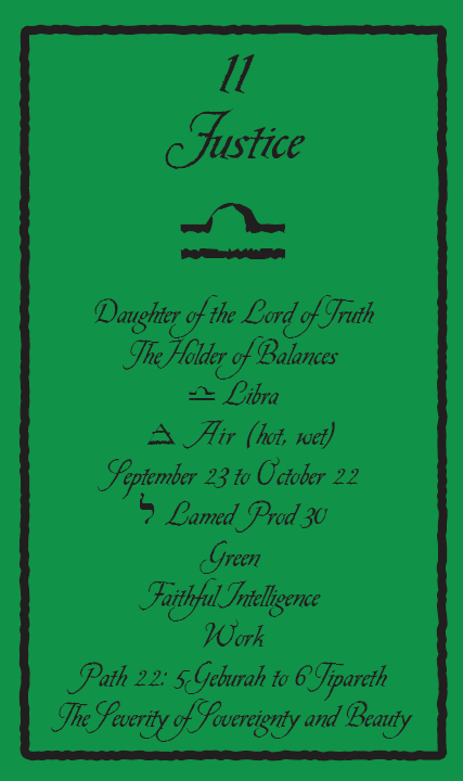 This card carries the number 11. In the Rider-Waite deck, Strength and Justice have swapped places because Waite saw links with the astrological signs Leo and Libra.
