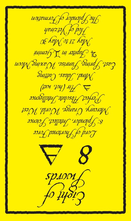 The 8 of Swords is about slowly regaining strength and energy. The 8 is an assignment number, and in the element of Swords it's a bit harder than usual.
