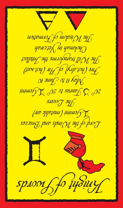 The Knight of Swords lacks the naivety of the Knight of Wands, he has analyzed the terrain ahead and weighed his options there. He knows what his own nature can throw into the mix, but does not let himself be held idle by that. The activities ahead will likely include the solving of conflicts and problems on your road to your ideal.