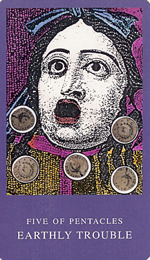 The 5 of Pentacles is an assignment-number card, and is about letting go of your securities. Pentacles element Earth (also) represents material posessions, so this card is about letting go of (some of) your worldly assets.