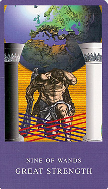The 9 represents rest after work, which is another thing (like 8) that the element Fire associated with Wands is not very comfortable with. Fire likes to keep going. This rest will probably be spent thinking about what to do next along the course to completion.