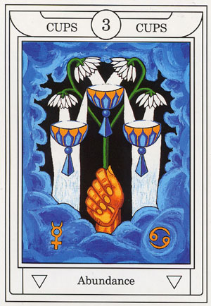 The 3 of Cups represents hope, faith and love. The 3 is a reward number and in this suit of Cups your feelings during that number will be that of joy and self-contentment.