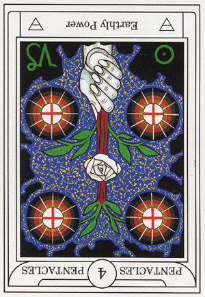 The 4 of Pentacles is about holding on to what you got. The number 4 represents structure and order, and fits well with the suit's element, Earth.