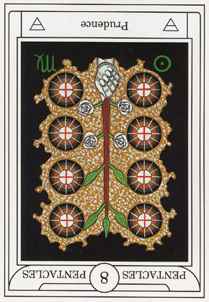 The 8 of Pentacles is about keeping up the hard work you're doing, and trying to be happy about doing that work at the same time. While the 3 of Pentacles is about completing a masterpiece, the 8 of Pentacles is about doing the apprentice work that makes you a master of your trade.