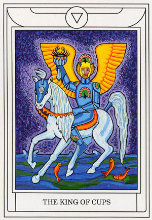 The King of Cups uses his intuition to achieve his ideals. Since Cups are turned inward, and Kings turned to the outside world, this card might be a difficult one, or it could be a powerful one.