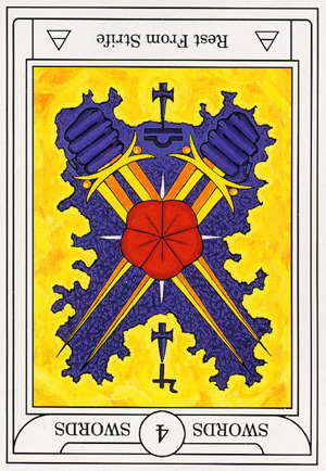4 is the first number in the cycle of giving things shape. It's about making things real. The element of Swords also relates to making things real, so this enhances the effect so much that arrogance can cause you to exhaust yourself.