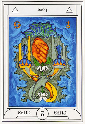 This the first assignment number of the Cups suit. Unlike Wands, with the Fire element, Cups, with the water element, has a lot more patience. Water is by nature more introspective, and this second card in the Cups suit is indeed about exploring yourself. The outcome is uncertain as always, but it usually results in better acceptance of yourself.
