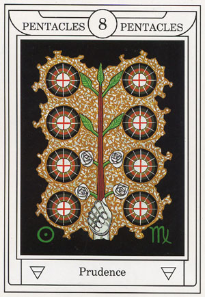 The 8 of Pentacles is about keeping up the hard work you're doing, and trying to be happy about doing that work at the same time. While the 3 of Pentacles is about completing a masterpiece, the 8 of Pentacles is about doing the apprentice work that makes you a master of your trade.