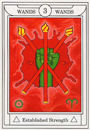 This card is about exposing your new ideas to the world. The Wand's element fire goes well with the number 3, as 3 is an output number, a number of results. Fire likes getting to results quickly.