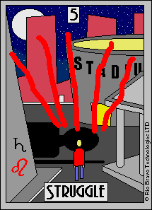 The 5 of Wands represents competition. The 5 is the second assignment number, and therefore a difficult card. 5 combined with the Wand's element fire challenges you. You'll have to fight hard for your idea, but you stand a good chance of succeeding.