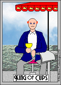 The King of Cups uses his intuition to achieve his ideals. Since Cups are turned inward, and Kings turned to the outside world, this card might be a difficult one, or it could be a powerful one.