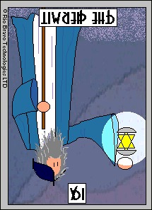 The Hermit shuts out the world and retreats into solitude to better understand some spiritual aspect of life. He opens to the cosmos and lets it's wisdom sink in. Hermits are often seen as wise old men who can guide a traveller along a journey.