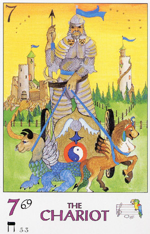 During the prevous card, The Lovers, all the wisdom of the first cards in the deck has been processed and a choice was made for personal growth. Now it's time to do something with all this baggage, to actually travel the road. A lot has been done so far, wisdoms have been accumulated and integrated into one's personality.