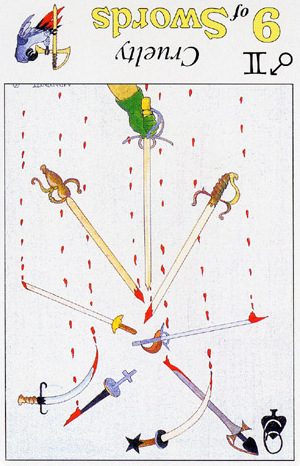 The 9 of Swords represents relief from cropped-up grief. The number 9 is a number of reward and rest and accomplishment. In the element of Swords there is not a lot of time for rest, but without any rest you'd just burn yourself out.