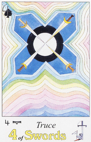 4 is the first number in the cycle of giving things shape. It's about making things real. The element of Swords also relates to making things real, so this enhances the effect so much that arrogance can cause you to exhaust yourself.