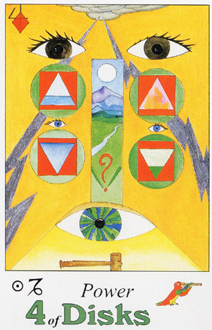 The 4 of Pentacles is about holding on to what you got. The number 4 represents structure and order, and fits well with the suit's element, Earth.