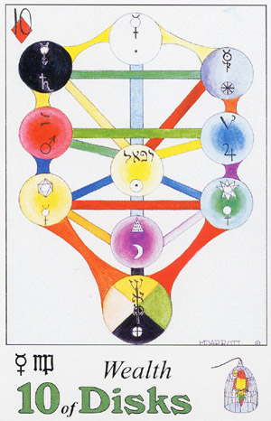 The 10 of Pentacles represents material posessions. The number 10 of Pentacles forms the links to the Ace (first card) of Wands (the first suit in the minor Arcana), and thus prepares to bring you back to the beginning of the minor Arcana, ready for a next cycle through the tarot.