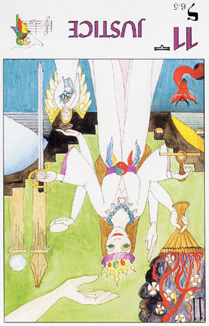This card carries the number 11. In the Rider-Waite deck, Strength and Justice have swapped places because Waite saw links with the astrological signs Leo and Libra.