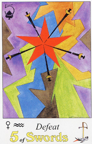 The 5 of Swords is about facing reality. The 5 is an assignment number, and in the slighly more difficult suit of Swords, it means you face a difficult challenge where your past experiences could hold you down.