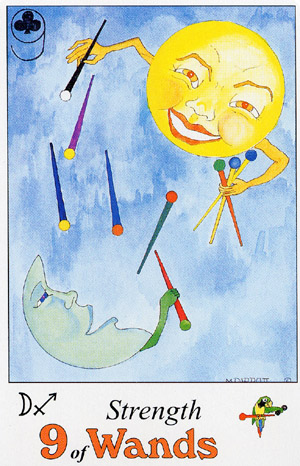 The 9 represents rest after work, which is another thing (like 8) that the element Fire associated with Wands is not very comfortable with. Fire likes to keep going. This rest will probably be spent thinking about what to do next along the course to completion.