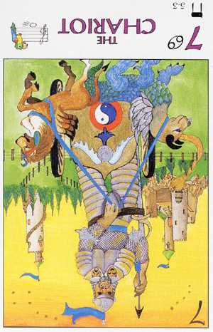 During the prevous card, The Lovers, all the wisdom of the first cards in the deck has been processed and a choice was made for personal growth. Now it's time to do something with all this baggage, to actually travel the road. A lot has been done so far, wisdoms have been accumulated and integrated into one's personality.