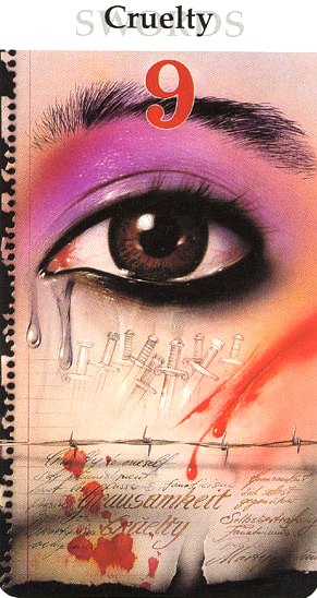 The 9 of Swords represents relief from cropped-up grief. The number 9 is a number of reward and rest and accomplishment. In the element of Swords there is not a lot of time for rest, but without any rest you'd just burn yourself out.
