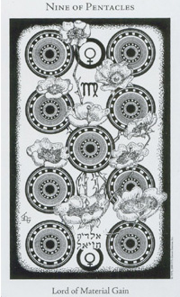 The 9 of Pentacles represents earned rest. The element Earth, attached to the Pentacles suit, appreciates the rest that completion of hard work brings. This is a good time for games and relaxation.