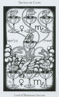 The 7 of Cups is about making a choice between different ideals. But Cups, with the water element, don't like making definitive choices that much, making this 7 in this suit a bit of a hard choice.