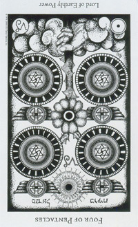 The 4 of Pentacles is about holding on to what you got. The number 4 represents structure and order, and fits well with the suit's element, Earth.