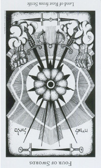 4 is the first number in the cycle of giving things shape. It's about making things real. The element of Swords also relates to making things real, so this enhances the effect so much that arrogance can cause you to exhaust yourself.