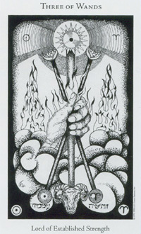 This card is about exposing your new ideas to the world. The Wand's element fire goes well with the number 3, as 3 is an output number, a number of results. Fire likes getting to results quickly.