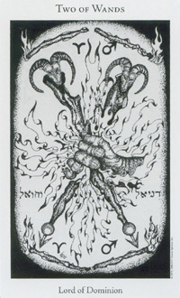 The 2 of Wands represents the research and digestion of a new idea. The number of this card and it's element are somewhat in conflict; while the 2 is focussed inwards, the Wand's element fire is outgoing. Fire wants to steam ahead while the blackbox 2 asks for patience.