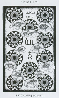 The 10 of Pentacles represents material posessions. The number 10 of Pentacles forms the links to the Ace (first card) of Wands (the first suit in the minor Arcana), and thus prepares to bring you back to the beginning of the minor Arcana, ready for a next cycle through the tarot.