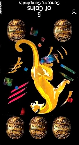 The 5 of Pentacles is an assignment-number card, and is about letting go of your securities. Pentacles element Earth (also) represents material posessions, so this card is about letting go of (some of) your worldly assets.