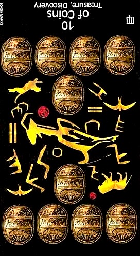 The 10 of Pentacles represents material posessions. The number 10 of Pentacles forms the links to the Ace (first card) of Wands (the first suit in the minor Arcana), and thus prepares to bring you back to the beginning of the minor Arcana, ready for a next cycle through the tarot.