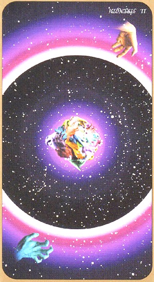 This card falls when you've completed all assignments, overcome all obstacles and are completely at peace with yourself due to your accomplishments. Yet Tarot wouldn't be Tarot if it didn't challenge you to enter entirely new worlds and start the process all over again.