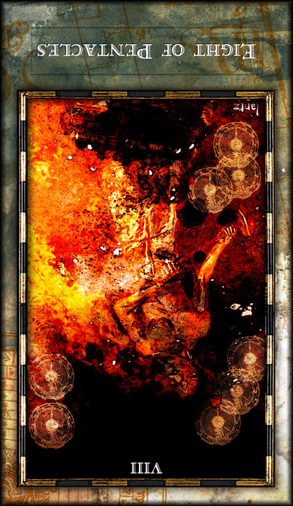 The 8 of Pentacles is about keeping up the hard work you're doing, and trying to be happy about doing that work at the same time. While the 3 of Pentacles is about completing a masterpiece, the 8 of Pentacles is about doing the apprentice work that makes you a master of your trade.