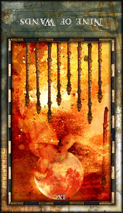 The 9 represents rest after work, which is another thing (like 8) that the element Fire associated with Wands is not very comfortable with. Fire likes to keep going. This rest will probably be spent thinking about what to do next along the course to completion.
