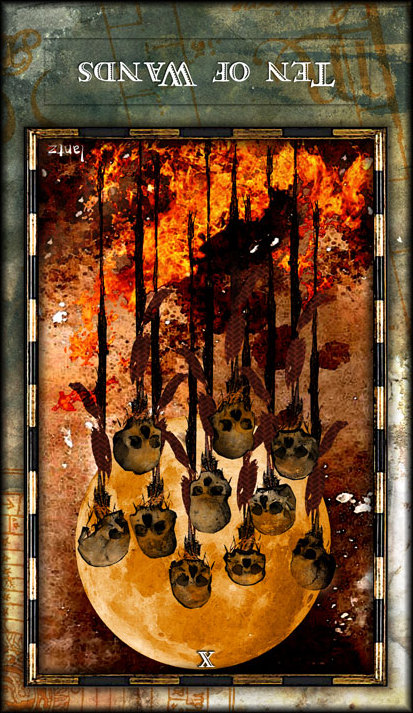 The 10 of Wands is therefore the transition from the element Fire (associated with Wands) to the element Water, associated with Cups. As you might imagine, this not the easiest of transitions.
