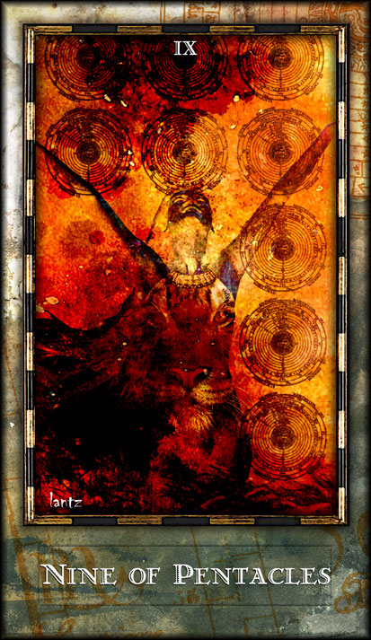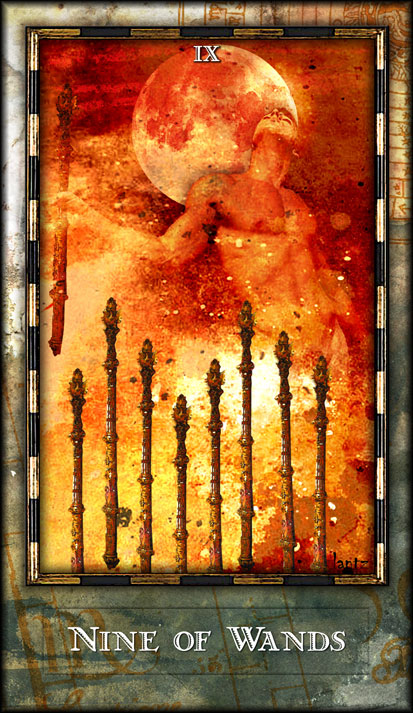 The 9 represents rest after work, which is another thing (like 8) that the element Fire associated with Wands is not very comfortable with. Fire likes to keep going. This rest will probably be spent thinking about what to do next along the course to completion.