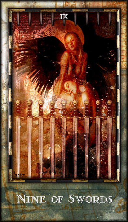 The 9 of Swords represents relief from cropped-up grief. The number 9 is a number of reward and rest and accomplishment. In the element of Swords there is not a lot of time for rest, but without any rest you'd just burn yourself out.
