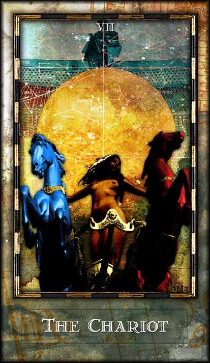 During the prevous card, The Lovers, all the wisdom of the first cards in the deck has been processed and a choice was made for personal growth. Now it's time to do something with all this baggage, to actually travel the road. A lot has been done so far, wisdoms have been accumulated and integrated into one's personality.