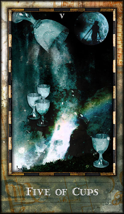 The 5 of Cups is about overcoming sadness and disappointment. You've let go of your old securities to embrace the new and exciting, now something has gone awry and you feel bad about that. But don't forget to notice those things that did go right.