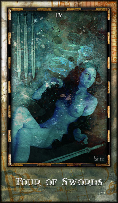 4 is the first number in the cycle of giving things shape. It's about making things real. The element of Swords also relates to making things real, so this enhances the effect so much that arrogance can cause you to exhaust yourself.