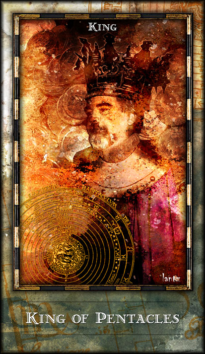 The King of Pentacles uses his Earthly attributes to rule. He goes about his work like an old style business man; he avoids unnecessary risks, aims for real results, and acts from confidence.