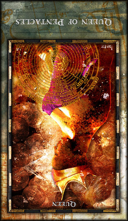 The Queen in the suit of Pentacles becomes aware of her Earthly attributes; she's reliable and sober, able to give good advice.