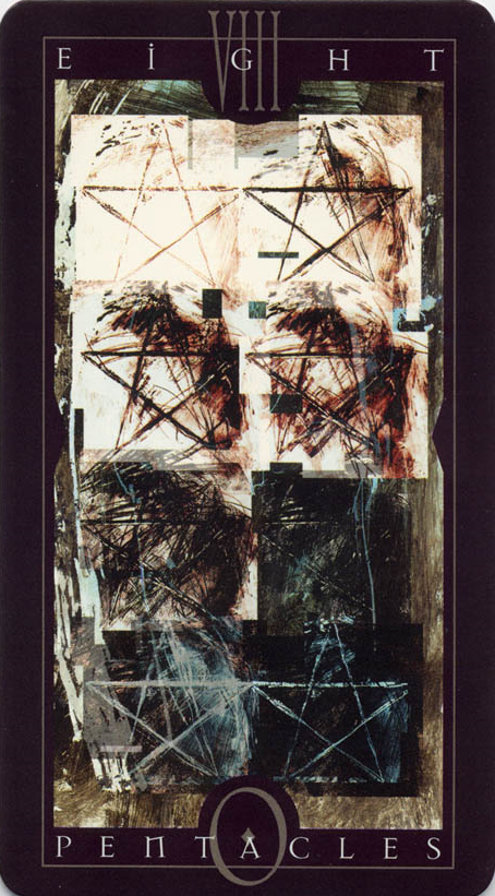 The 8 of Pentacles is about keeping up the hard work you're doing, and trying to be happy about doing that work at the same time. While the 3 of Pentacles is about completing a masterpiece, the 8 of Pentacles is about doing the apprentice work that makes you a master of your trade.