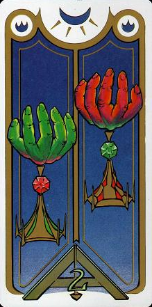 This the first assignment number of the Cups suit. Unlike Wands, with the Fire element, Cups, with the water element, has a lot more patience. Water is by nature more introspective, and this second card in the Cups suit is indeed about exploring yourself. The outcome is uncertain as always, but it usually results in better acceptance of yourself.