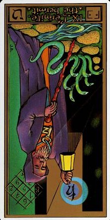 The Hermit carries the number 9. This is the highest base number. After 9 the composed numbers emerge. Therefore the number 9 is the gateway to a higher order. It is also a place to rest before embarking on the next leg of the journey.