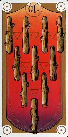 The 10 of Wands is therefore the transition from the element Fire (associated with Wands) to the element Water, associated with Cups. As you might imagine, this not the easiest of transitions.